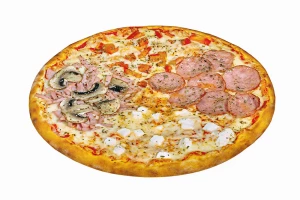 Классическая пицца северной Италии:Кусочек пепперони; кусочек ветчина + шампиньоны, кусочек маргариты, кусочек сырной пиццы с «Фета» и все это с томатным соусом и сыром моцарелла.