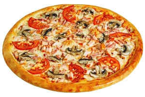 Сочная куриная грудка,ветчина, шампиньоны, соус «Помадоро», томаты, сыр моцарелла.