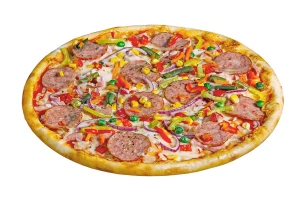 Острая мексиканская пицца с соусом-чили, сервелат, ветчина, лучок, томат, мексиканскими овощами, сыром моцарелла.