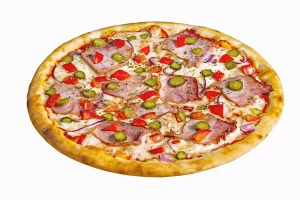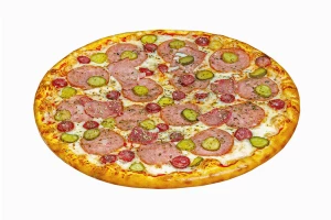 Настоящая мужская пицца: копченая колбаска, копченое мясо, охотничьи колбаски, маринованные огурчики, соус, сыр «Моцарелла».