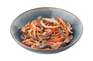 Говядина мраморная, чесночная паста, устричный соус, соевый соус, сливки, грибы шитаке, морковь, лук красный